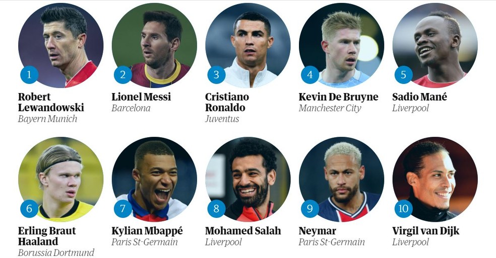 Jornal divulga ranking final dos 100 melhores do mundo com Lewandowski em 1º; Neymar é o 9º
