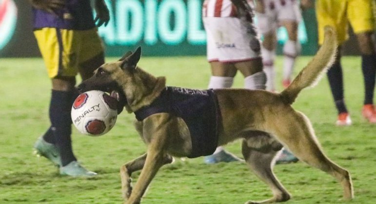 Na final do Pernambucano, cachorro da polícia invade o campo e rouba uma das bolas do jogo
