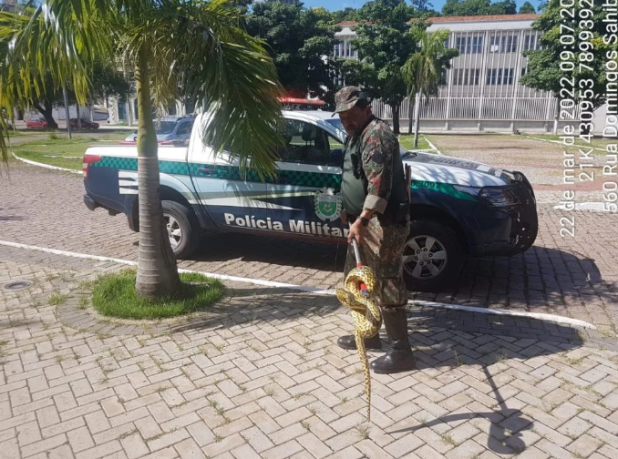 Um filhote de animal silvestre da espécie Eunectes notaeus (sucuri-amarela) foi capturado hoje (22) pela manhã, por Policiais Militares Ambientais de Corumbá. A equipe foi acionada por um funcionário que trabalha no Centro de Convenções, na área portuária da cidade, que informava ter encontrado o animal no auditório do prédio.