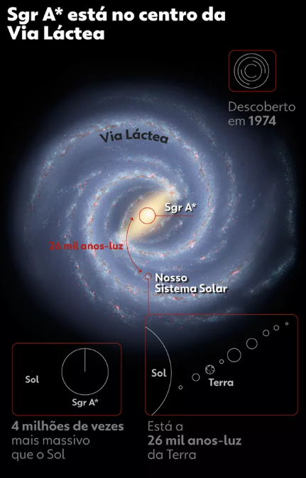 A imagem do Sagitário A* é o buraco negro localizado ao centro da nossa galáxia, na Via Láctea, e pela primeira vez foi visto em uma imagem.