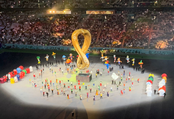 Na sequência, ocorreram o desfile das 32 bandeiras das seleções participantes do torneio, os uniformes dos times e os mascotes das Copas passadas também foram apresentados. É claro que o mascote dessa edição, o La'eeb, que significa jogador super habilidoso, desenvolvido a partir de lenços de cabeça bem típicos da cultura árabe, também fez muito sucesso.