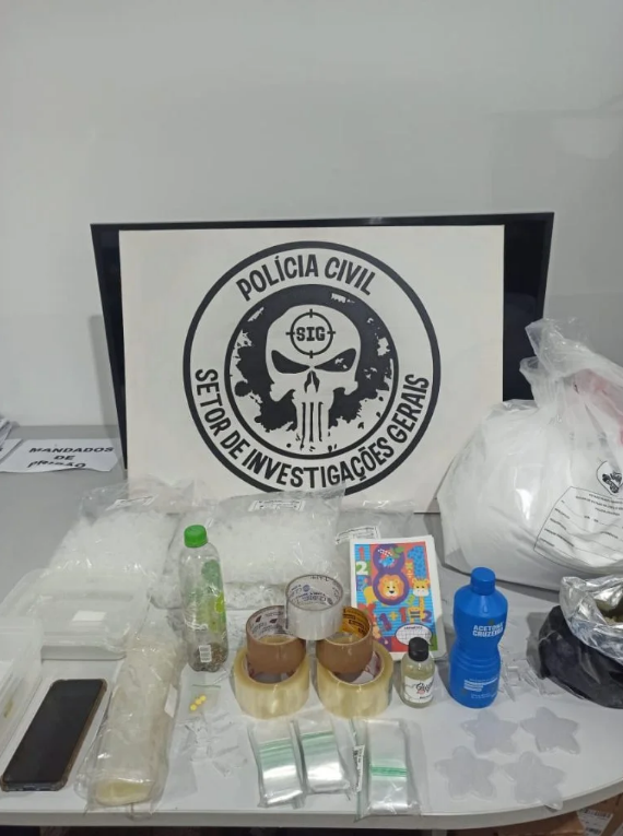 Durante o cumprimento da ordem judicial de prisão, a equipe se deparou com um verdadeiro laboratório de produção e refino de drogas. No local foram encontrados 15Kg de substância para refino, 1.2Kg de pasta base, 3500 pinos e 300 embalagens zíper, próprios para venda, além de vasilhames utilizados para prensa.