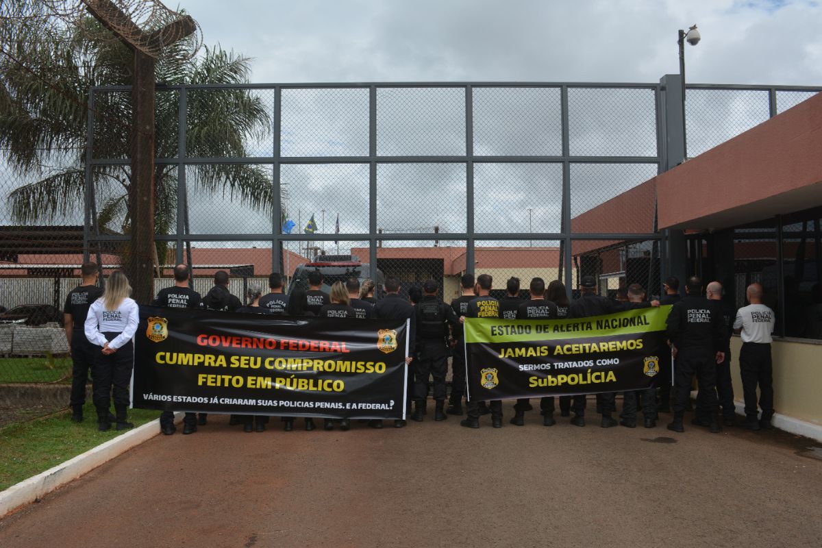 Policiais penais federais fizeram, na manhã desta terça-feira (5), um protesto em frente ao presídio mantido pelo Ministério da Justiça e Segurança Pública em Campo Grande.