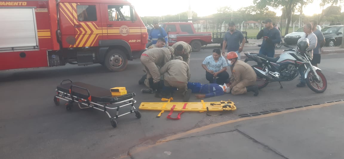A VITIMA: SEXO MASCULINO, V.R.B.O (20 A), CONDUTOR DA MOTO, EM DECÚBITO DORSAL NA VIA, CONSCIENTE E ORIENTADO, APRESENTAVA FRATURA EXPOSTA EM SEU TORNOZELO ESQUERDO.