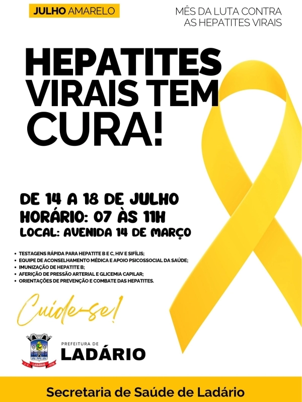 Em alusão ao Julho Amarelo, mês de conscientização sobre as hepatites virais, a Secretaria Municipal de Saúde de Ladário realizará uma ação de prevenção e promoção da saúde entre os dias 14 e 18 de julho, das 7h às 11h, na Avenida 14 de Março.