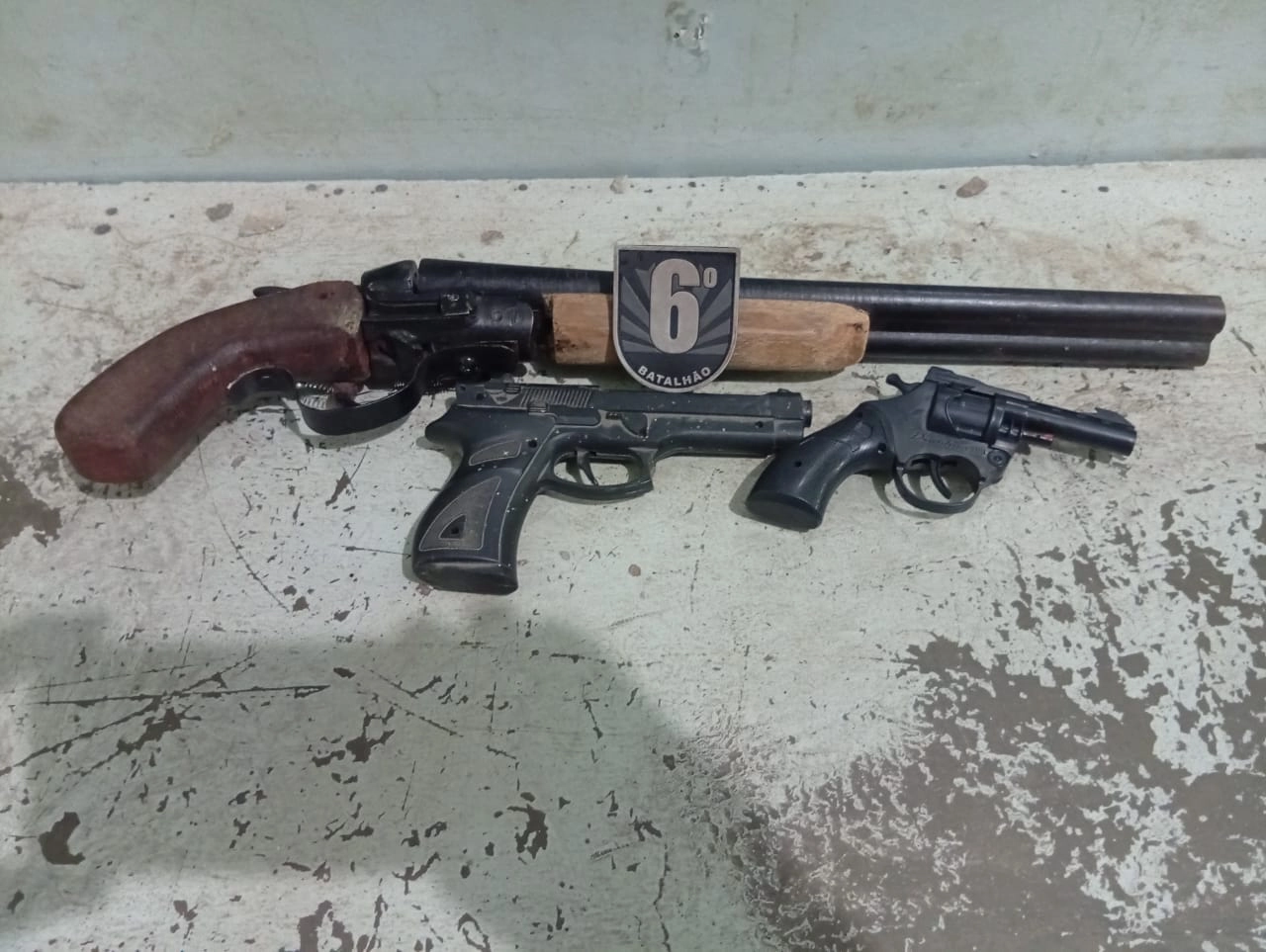 Diante das informações, os policiais foram conduzidos pela vítima até o local onde o armamento estava guardado, encontrando uma arma de fogo artesanal do tipo garrucha calibre 12, além de dois simulacros — um em formato de pistola e outro de revólver.