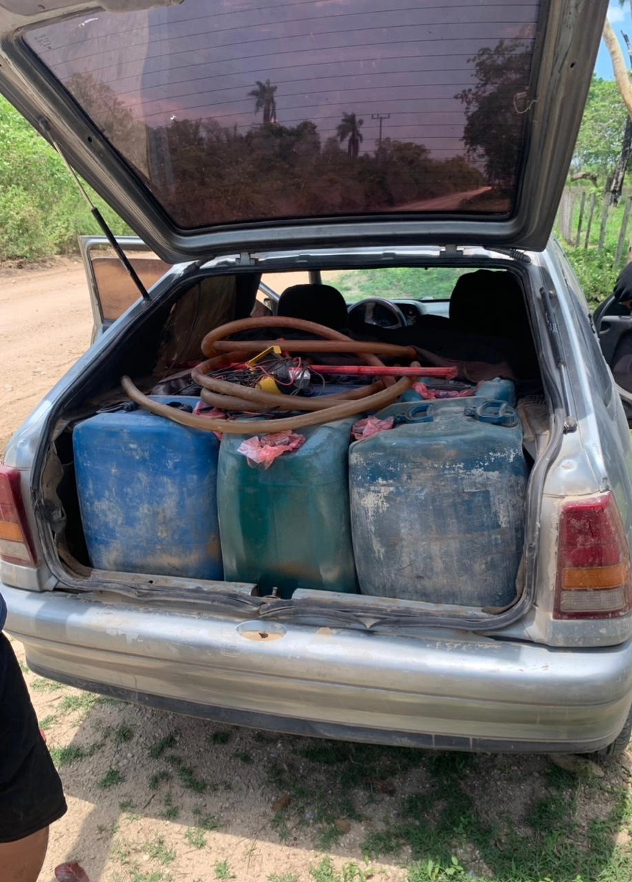 A equipe da Força Tática, em operação preventiva na região de fronteira, abordou um veículo que trafegava em alta velocidade. Durante a vistoria, foram encontrados 13 galões de 50 litros, totalizando aproximadamente 650 litros de combustível (diesel) transportados sem autorização legal.