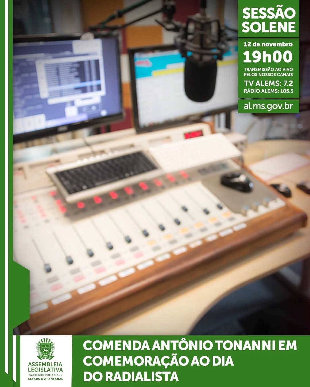 Por proposição do deputado Lucas de Lima (sem partido), a Assembleia Legislativa de Mato Grosso do Sul (ALEMS) realiza nesta quarta-feira (12), a partir das 19h no plenário Júlio Mai, sessão solene em homenagem ao Dia do Jornalismo, comemorado em 7 de novembro. Na solenidade, será entregue a radialistas a Comenda Antônio Tonani, como forma de reconhecimento pelos serviços prestados ao rádio e à população sul-mato-grossense.