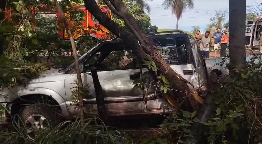 Ao chegarem ao local, os bombeiros encontraram uma caminhonete que havia saído da pista e colidido contra árvores às margens da rodovia. O impacto travou ambas as portas do veículo, obrigando os ocupantes a deixarem o interior por uma das janelas.